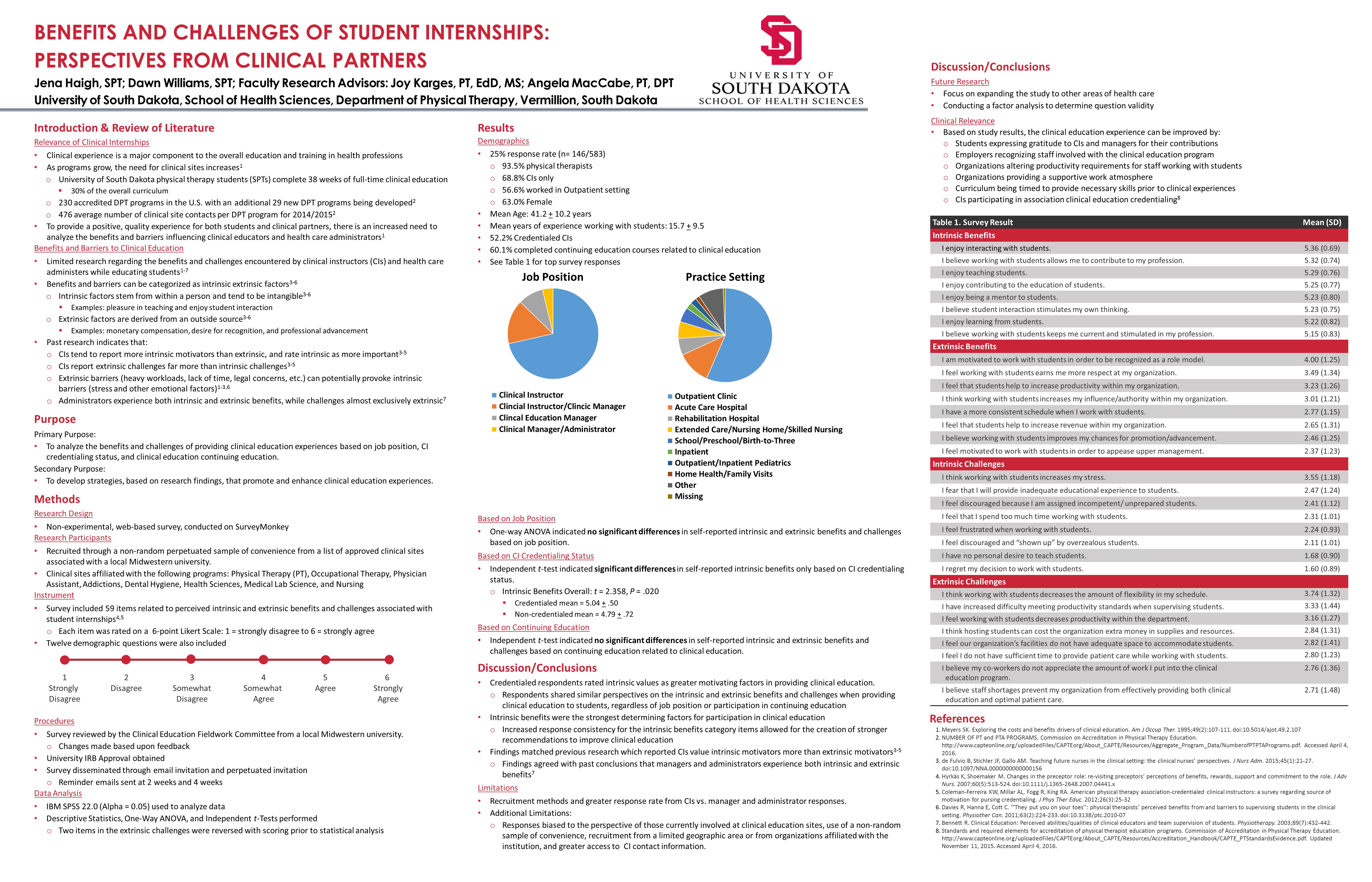 As a current PT student, I know how valuable clinical education is. That is why I would hate to see PT programs be forced to decrease the amount of time spent in clinical education due to lack of available sites. One of the purposes of our study was to develop strategies based on CI and manager/administrator responses to promote and enhance clinical education experiences. Programs should consider implementing these strategies (found in the upper right-hand corner of the poster) in order to improve relationships with clinical partners. Hopefully, these changes will ultimately increase the number of available clinical site placements in order to accommodate for the growing number of programs. Also, as financial resources are a common point of discussion for both students and educational programs, the results of our study indicate that extrinsic benefits are not a major motivating factor, so programs should not have to make changes such as providing financial incentives to clinical partners to participate in clinical education.