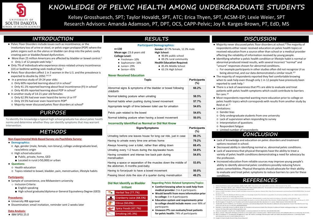 3. Very interesting poster with a lot of useful information. The last point of the poster in the conclusion talks about education from reliable sources which I think is very important because I think that information like this should be readily available and reliable. My question is, since you all have done research in this area, what are some good resources that a therapist or even a patient could use to become more educated in pelvic health?